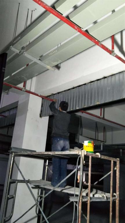 挡烟垂壁在安装时的高度为500mm,统一从梁底或板底下返500mm。安装时当遇到较大桥架时可将档烟垂壁断开,然后桥架内用防火堵料封闭,有较大直径的消防管道时,安装有一定困难,可将方管龙骨位置按实际情况做一调整,并将封板套割,以确保档烟垂壁的安装到位。如果顶板上的照明灯的线盒已安装到位,挡烟垂壁的位置与照明灯的位置冲突时可将档烟垂壁适当移位,确保通道顶板照明灯能安装到位。